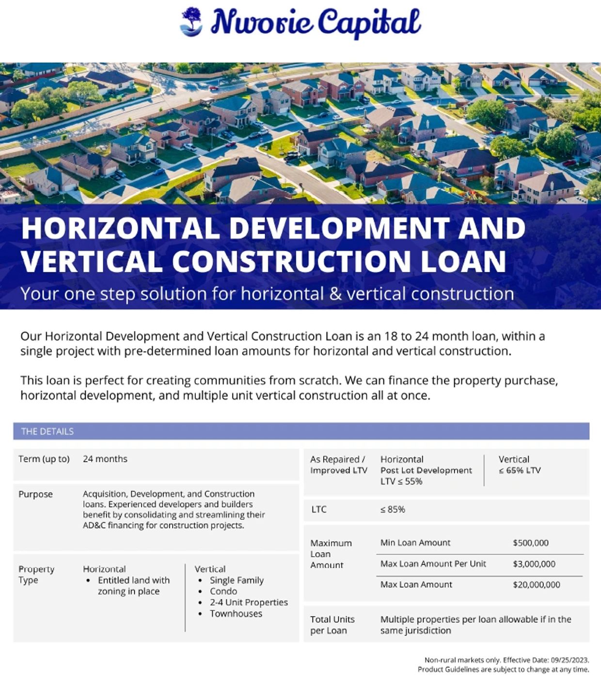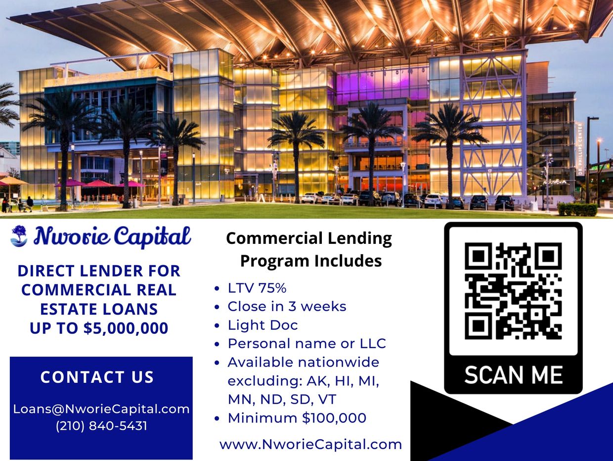 COMMERCIAL: Nworie Capital is a direct private lender for commercial real estate. Commercial retail loans may be issued to companies or individuals and do not require an LLC, personal income verification, or tax returns. Commercial housing includes land acquisition, land development, and vertical construction for building subdivisions of single and multi-family residential communities.